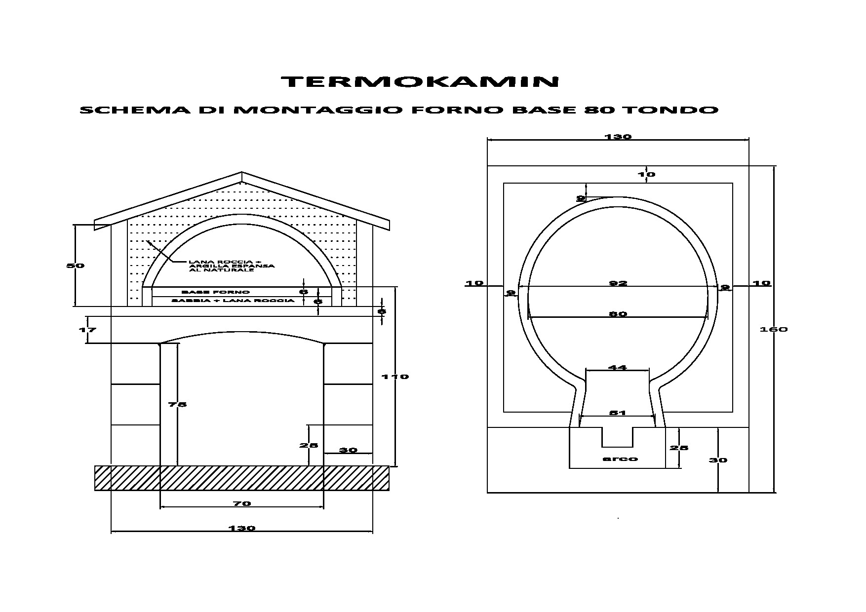 Forno 80 cm di diametro interno,prefabbricato in cemento refrattario,con frontino uscita fumi, resistente ad altissime temperature. Base a pezzo unico e cupola di 2 pezzi separati,per un rapido montaggio.Peso complessivo 250 Kg. Capacita' 3 pizze. Disponibile anche versione 110 E 145 cm interno e TUTTI I dettagli tecnici.