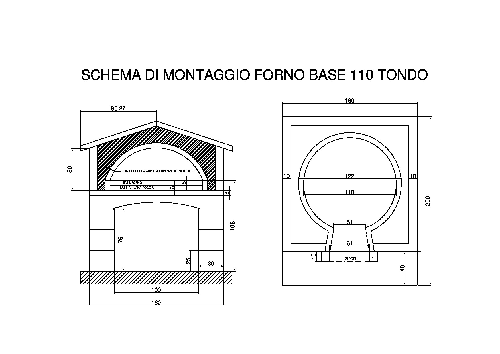 Forno 110 cm di diametro interno,prefabbricato in cemento refrattario,con frontino uscita fumi, resistente ad altissime temperature. Base a pezzo unico e cupola di 4 pezzi separati,per un rapido montaggio.Peso complessivo 450 Kg. Capacita' 6 pizze. Disponibile anche versione DA 80 E 145 cm interno e TUTTI i dettagli tecnici.